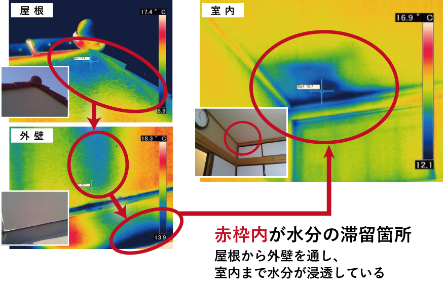 目視ではわからない水分の滞留箇所が赤外線画像では、判別できます。